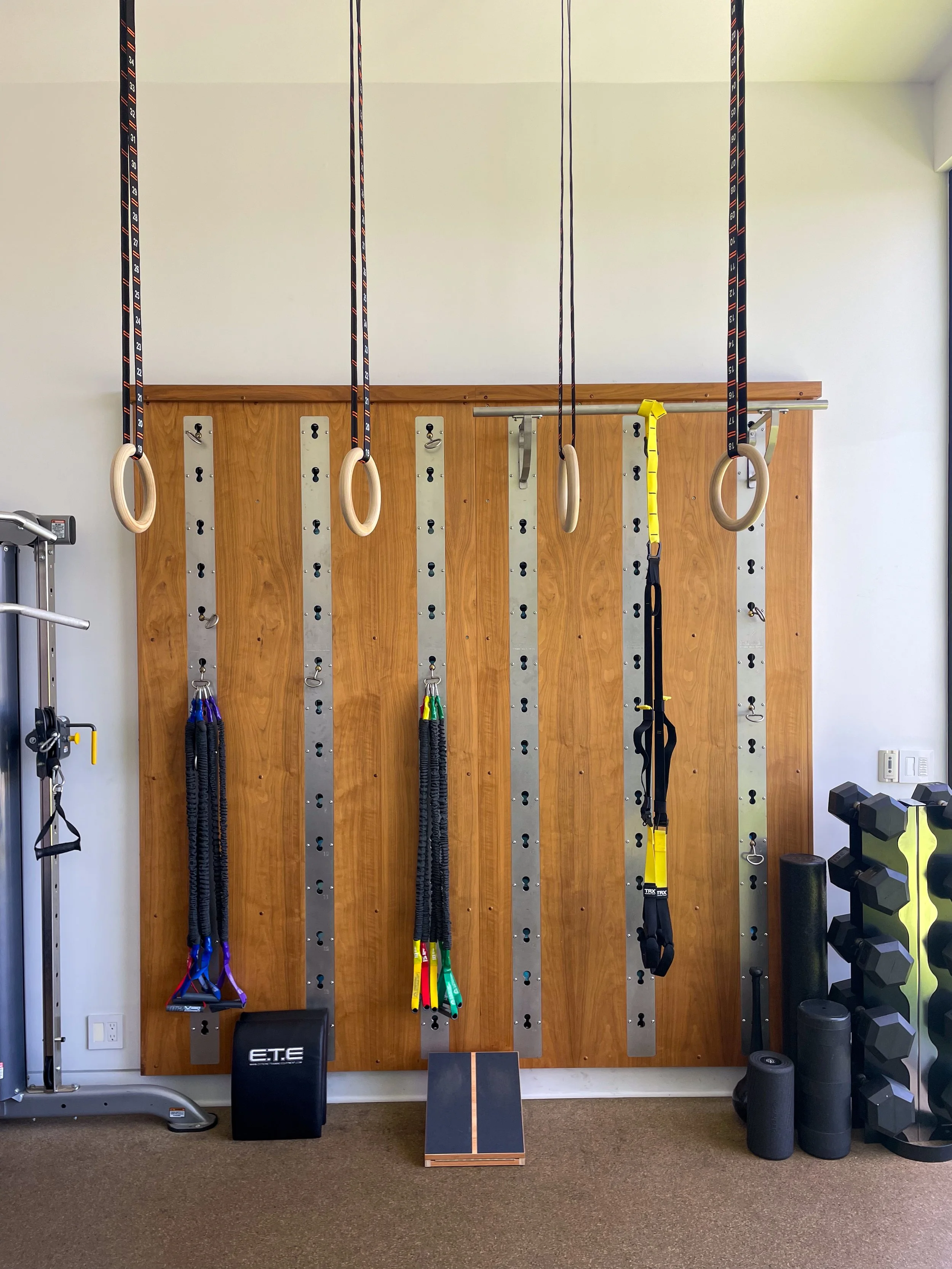 Designed for the business professional balancing demanding work and family life. This build uses the symmetry of fluted wall panels and a balance of light and dark tones to create a grounded training environment. Warm wood textures soften steel, while clean lines and intentional layout bring power to every session.