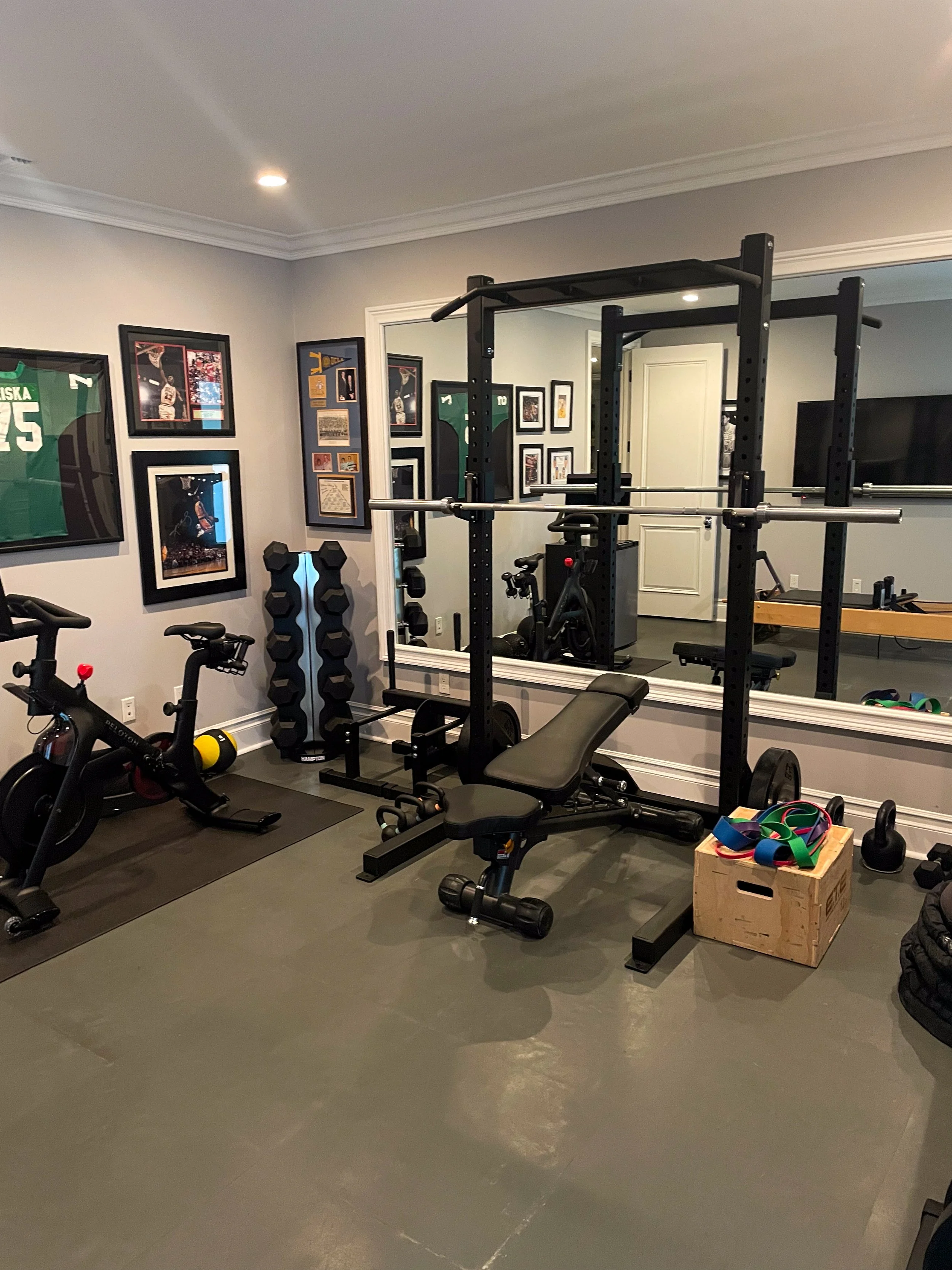 Curated sports memorabilia bring a personal layer of identity to the space, transforming the gym into a reflection of the family’s athletic journey. Framed artwork, meaningful trophies, and performance inspired visuals add character and motivation, creating an environment that celebrates past achievements while fueling future goals.